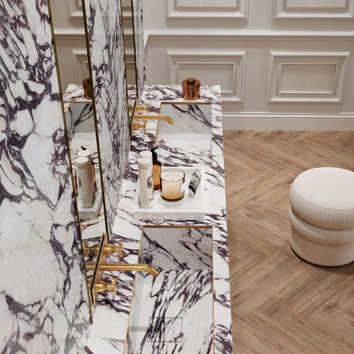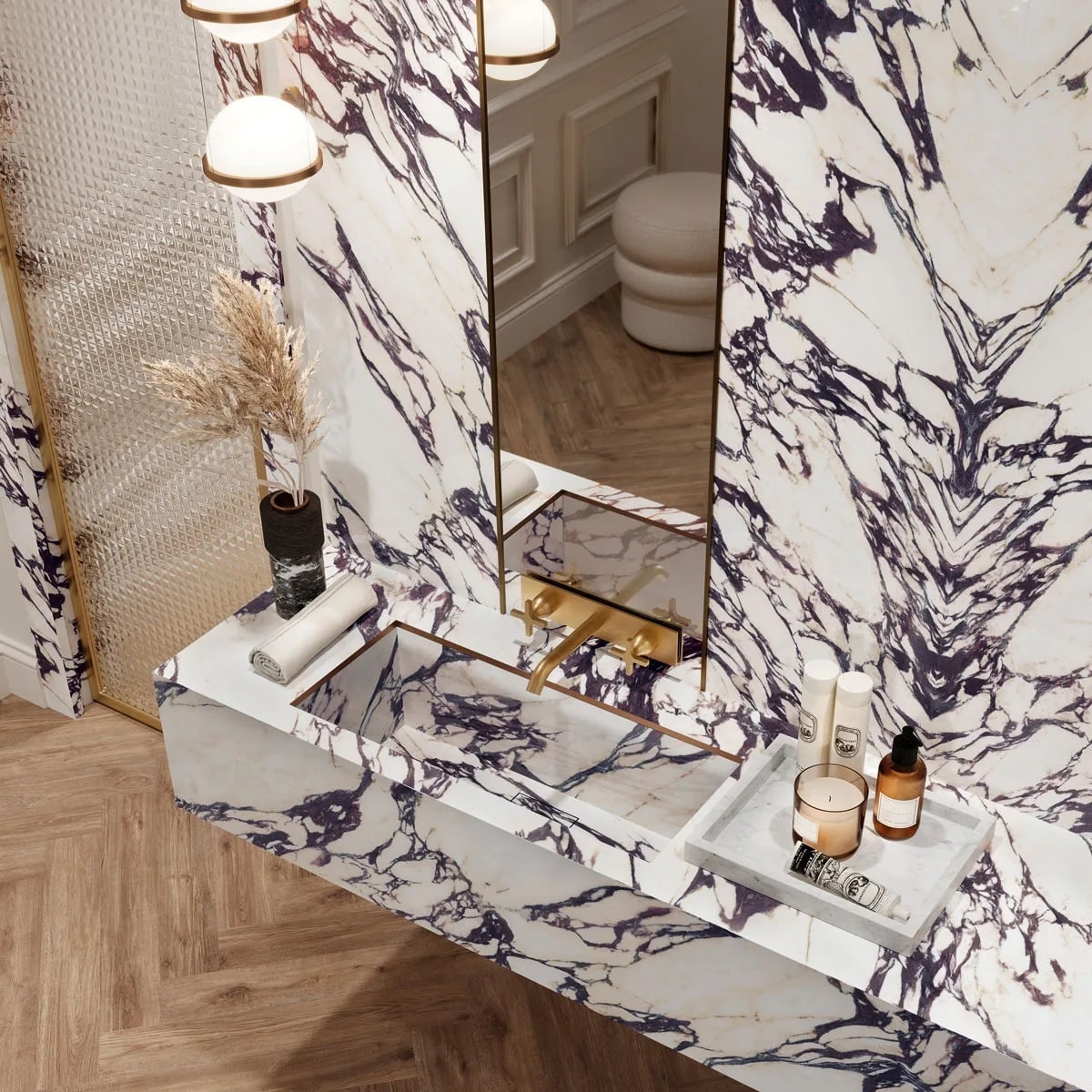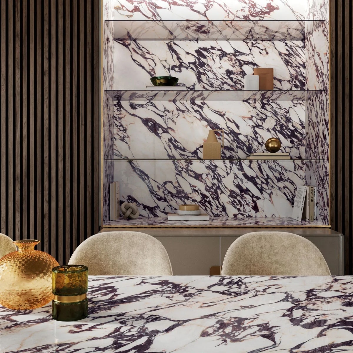 Роскошная керамическая столешница, идеально воссоздающая смелый и эффектный вид одноименного натурального мрамора. Теплый белый базовый тон Infinity Calacatta Viola пронизан интенсивными фиолетовыми прожилками и золотистыми оттенками, создавая яркие контрасты и придавая интерьеру особый характер.
